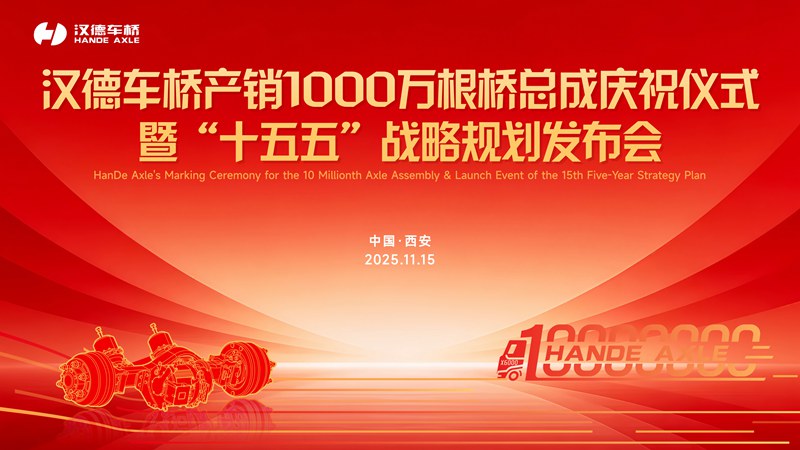 产销突破1000万根,是一个沉甸甸的数字,更是汉德车桥非凡发展历程的浓缩与见证。汉德车桥自陕汽集团车桥分厂改制成立。从陕西宝鸡麦李西沟起步,二十三年砥砺奋进,汉德车桥已成长为国内商用车桥行业的领军企业。从最初单一的重卡车桥产品,到如今涵盖全系列卡车桥、客车桥、非公路车桥、电驱桥的完整产品矩阵;从年产2.4万根到如今年产110万根的产业布局,汉德车桥用实力铸就了中国制造业的又一典范。